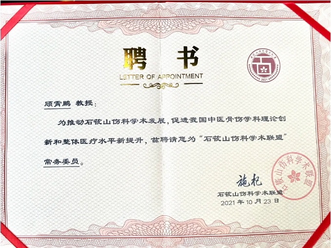 我院常務副院長顧霄鵬還被聘為“石筱山傷科學術聯(lián)盟”常務委員。