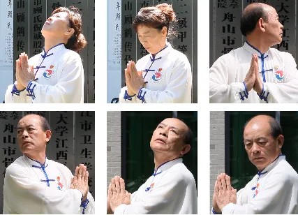 雙手掌心相合,歸于胸前,頭部緩緩后仰、前屈、左轉(zhuǎn)、右轉(zhuǎn),各做三次。左、右轉(zhuǎn)動(dòng)頭部時(shí),雙手要往反方向盡力拉伸,舒展頸肩部的肌肉(頸斜角肌、斜方肌、肩胛提肌)。