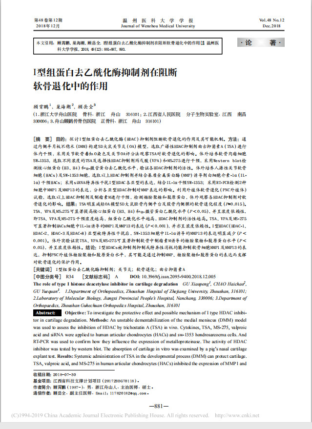 由我院掌門人顧岳全、顧霄鵬等撰寫的論文《I型組蛋白去乙?;敢种苿┰谧钄嘬浌峭嘶械淖饔谩吩谥袊萍己诵钠诳⒅袊咝?yōu)秀科技期刊《溫州醫(yī)科大學(xué)學(xué)報》2018年48卷第12期上發(fā)表。