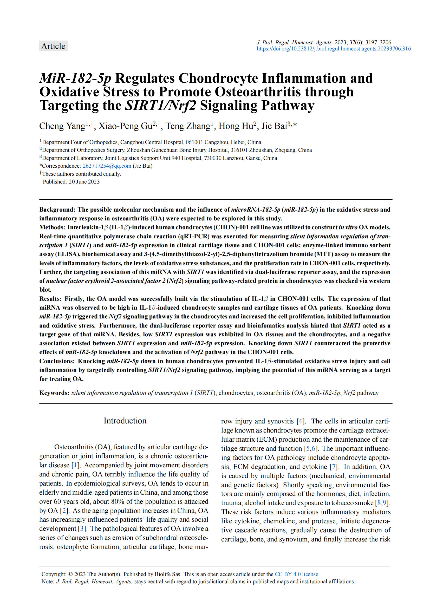 由我院顧霄鵬、胡鴻等醫(yī)師參與撰寫的醫(yī)學(xué)論文《MiR-182-5p Regulates Chondrocyte Inflammation and Oxidative Stress to Promote Osteoarthritis through Targeting the SIRT1/Nrf2 Signaling Pathway》于2023年6月20日在SCI期刊Journal of Biological Regulators and Homeostatic Agents上發(fā)表。