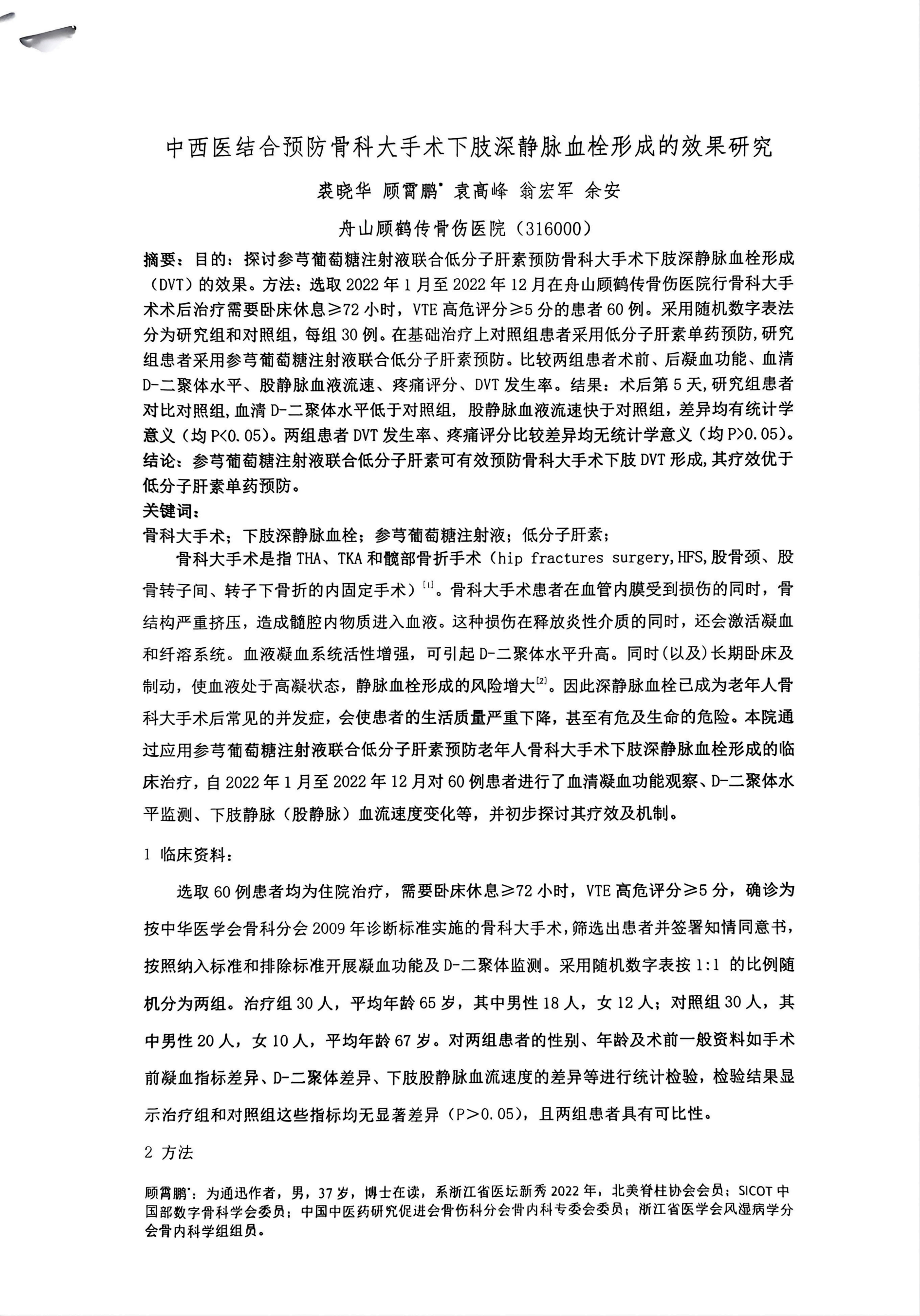 由我院裘曉華、顧霄鵬、袁高峰、翁宏軍、余安醫(yī)師撰寫的醫(yī)學論文《中西醫(yī)結合預防骨科大手術下肢深靜脈血栓形成的效果研究》在《康復》雜志2023年9月刊上發(fā)表。