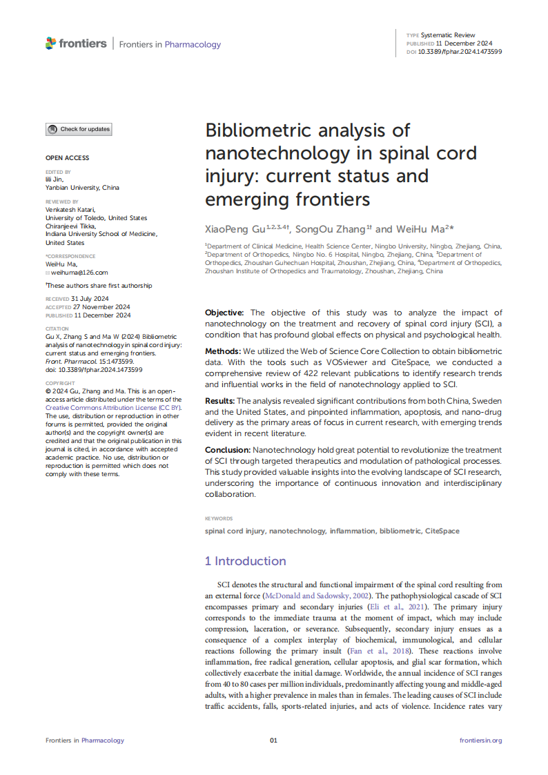 由我院顧霄鵬、張宋歐等醫(yī)師參與撰寫的醫(yī)學論文《Bibliometric analysis of nanotechnology in spinal cord injury: current status and emerging frontiers》于2024年12月11日在SCI期刊Front Pharmacol上發(fā)表。