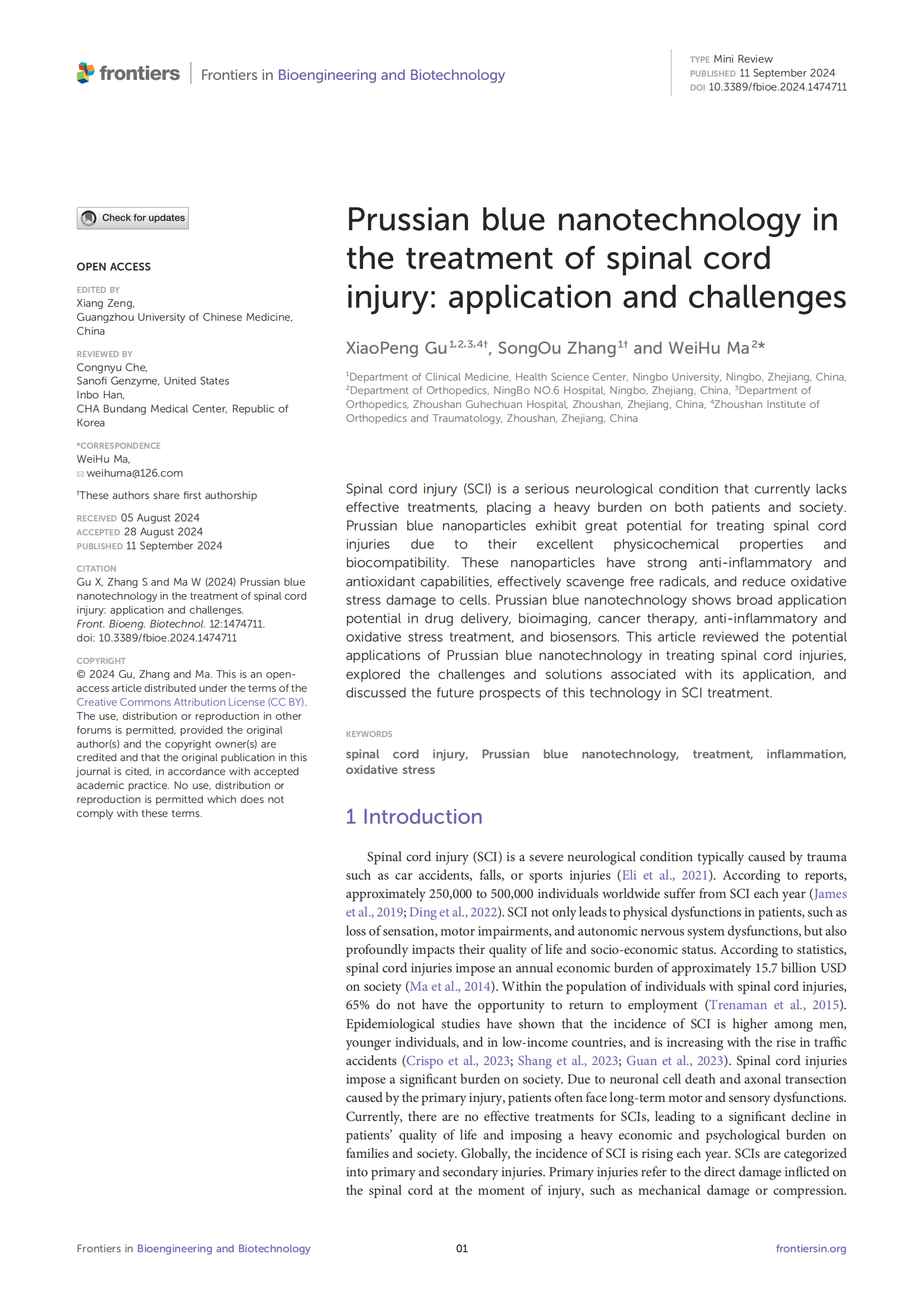 由我院顧霄鵬、張宋歐等醫(yī)師參與撰寫的醫(yī)學(xué)論文《Prussian blue nanotechnology in the treatment of spinal cord injury :application and challenges》于2024年9月11日在SCI期刊Front Bioeng Biotechnol上發(fā)表。
