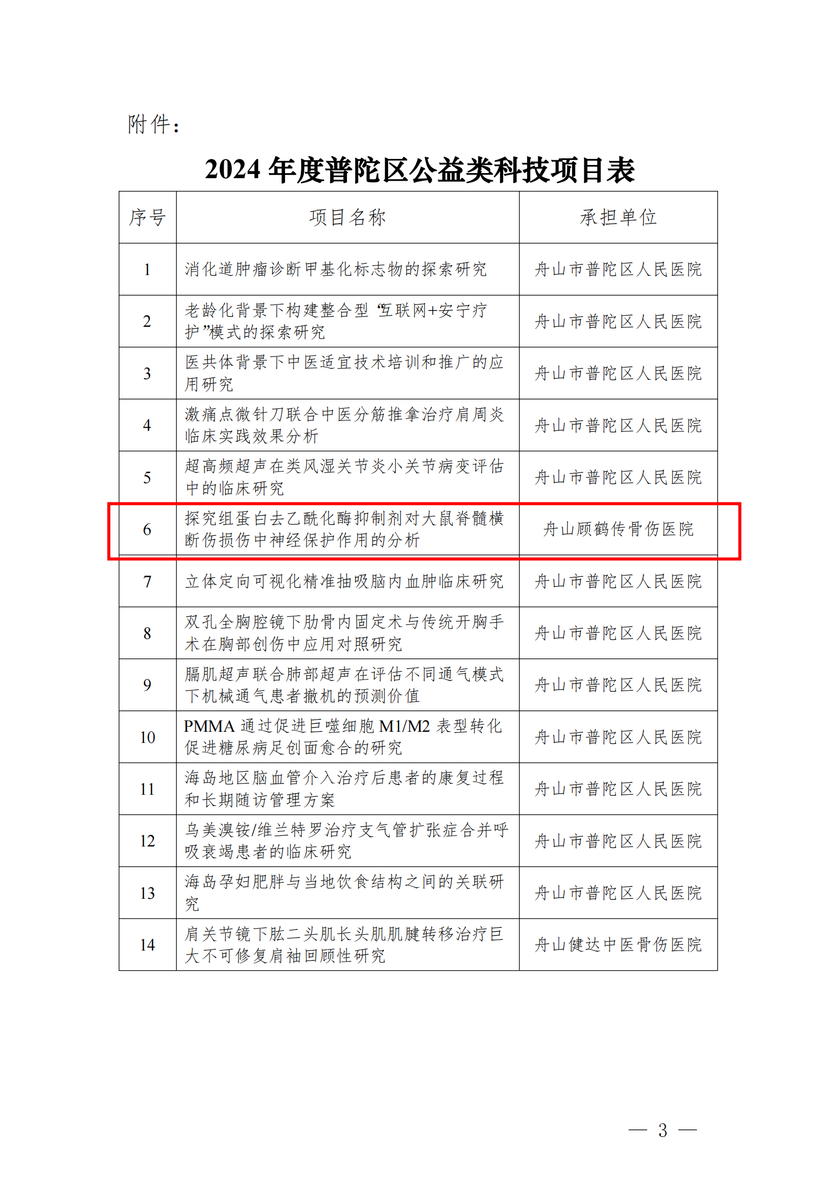 我院《探究組蛋白去乙酰化酶抑制劑對大鼠脊髓橫斷傷損傷中神經(jīng)保護(hù)作用的分析》被納入2024年度普陀區(qū)公益類科技項(xiàng)目