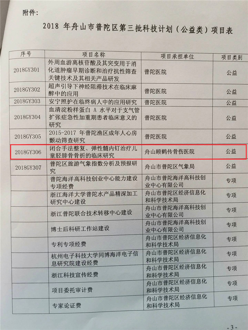 我院的《閉合手法整復(fù)、彈性髓內(nèi)釘治療兒童脛腓骨骨折的臨床研究》被納入2018舟山市普陀區(qū)第三批科技計(jì)劃(公益類(lèi))項(xiàng)目。