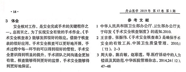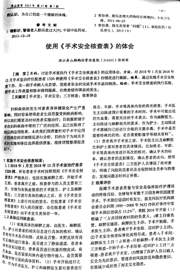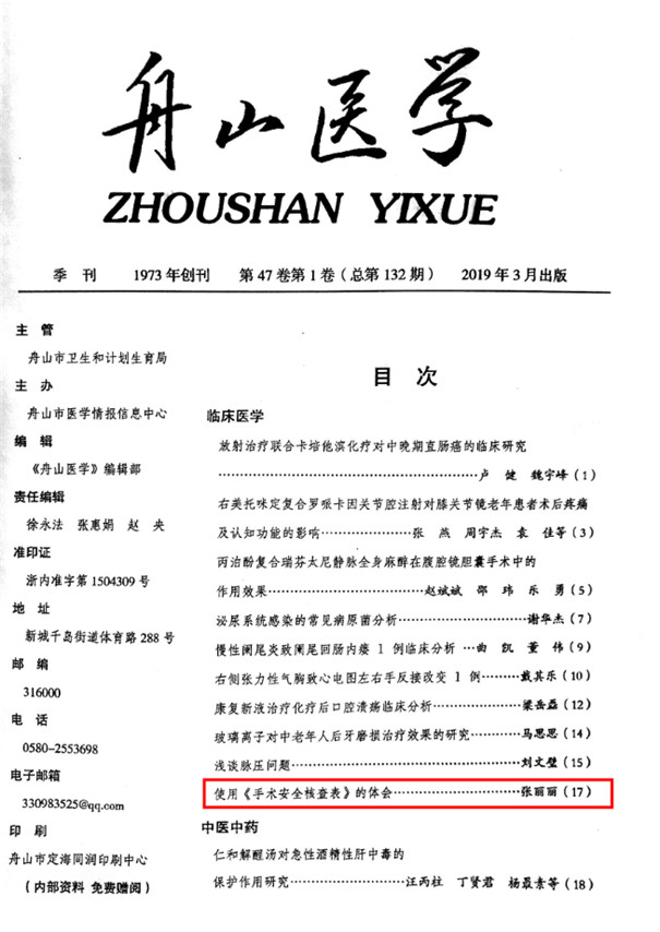 由我院張麗麗護(hù)士長撰寫的論文《使用<手術(shù)安全核查表>的體會(huì)》在《舟山醫(yī)學(xué)》2019年47卷第1期上發(fā)表。
